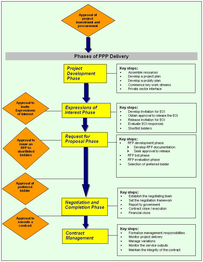 The following flow chart outlines the key phases in delivering a PPP project. Each of these phases is expanded upon in this guidance material.
