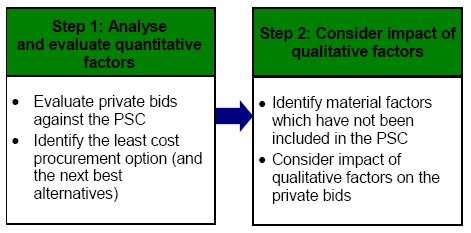 Assessing the private bids against the PSC provides a quantitative answer to the value for money question. However a complete value for money assessment requires consideration of qualitative factors along with the quantitative assessment. Therefore, identifying the best outcome requires a flexible valuation process and, therefore, the consideration of the qualitative factors associated with the bidders' Proposals that have not been explicitly valued. Figure 9-1 shows how this process should proceed.