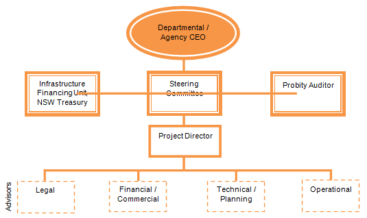 Consistent with the National Guidelines all PPP projects should be managed by a project director, Project Steering Committee and dedicated project team. The project team members should include financial, technical, operational and legal skills to reflect the breadth of skills brought to the project by a private sector consortium and should have clear lines of accountability and quality of resources applied to the project team. Figure 4.1 outlines a typical project management structure.